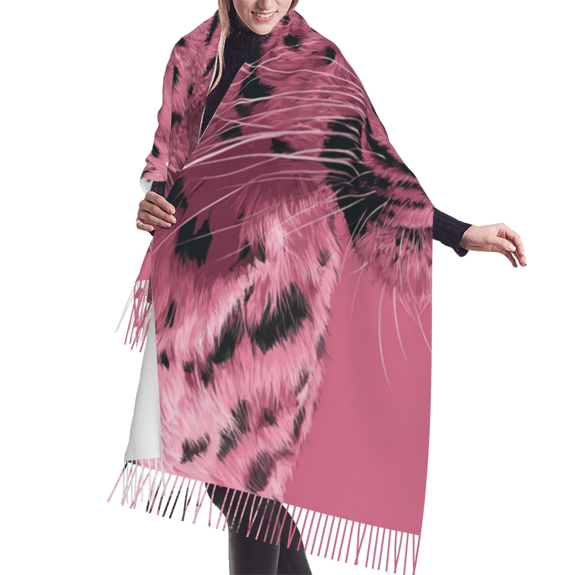 Pink Leopard Print Faux Cashmere Scarf – Bold Animal Pattern Long Winter Wrap with Tassels (77" x 27")