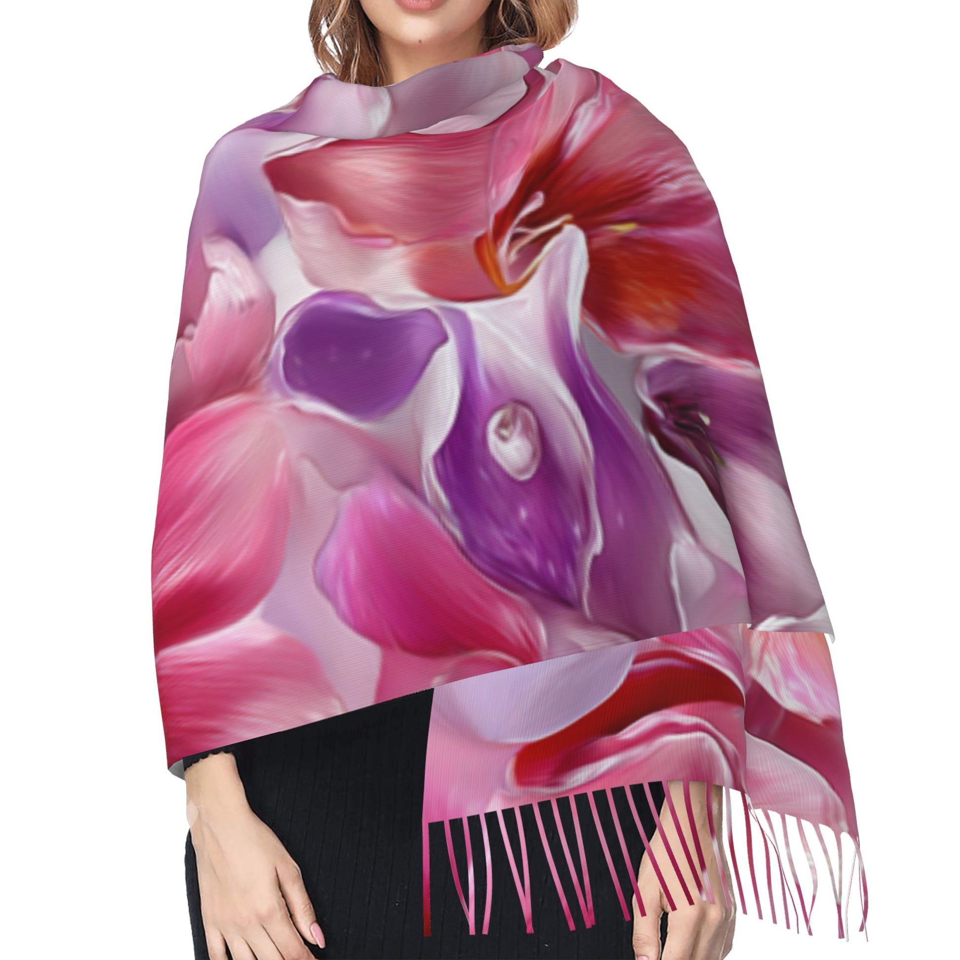 Colorful Floral Faux Cashmere Scarf – Romantic Multicolor Blossom Print Long Wrap with Tassels (77" x 27")