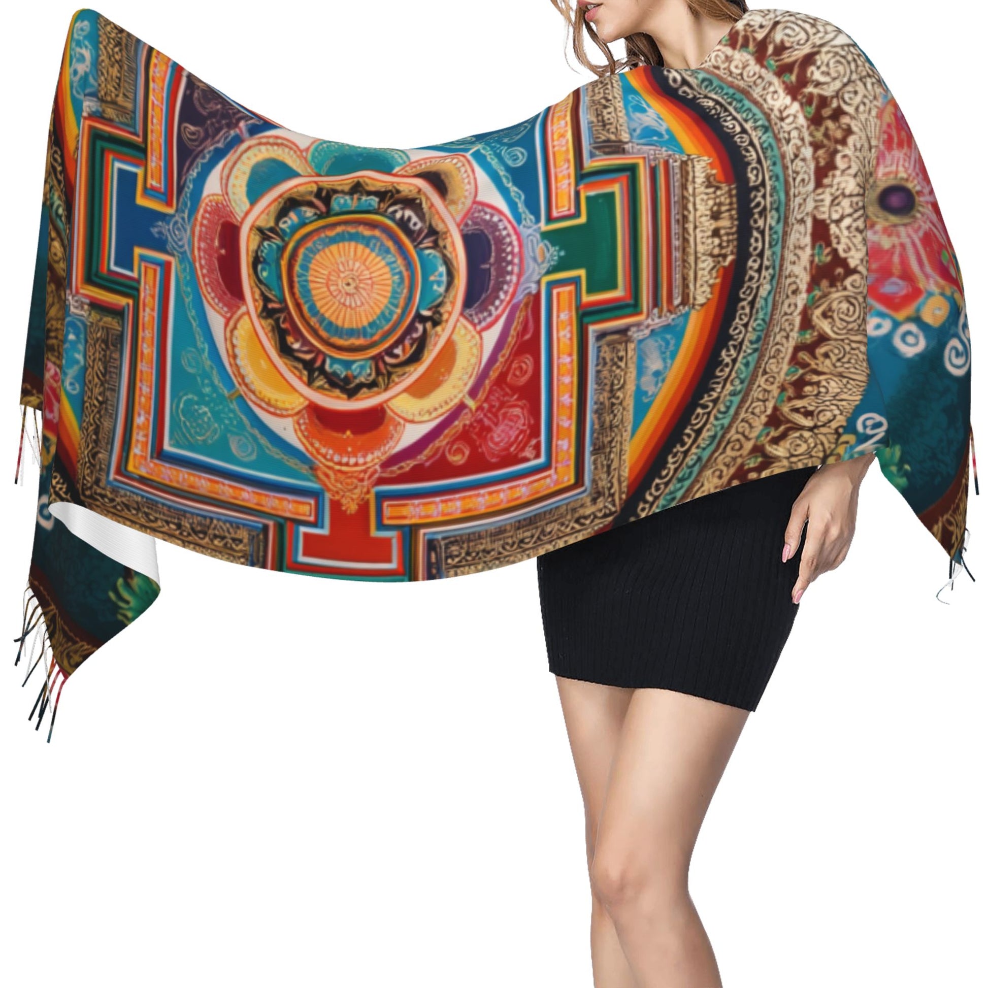 Mandala Pattern Faux Cashmere Tassel Scarf – Colorful Boho Spiritual Long Wrap (77" x 27")
