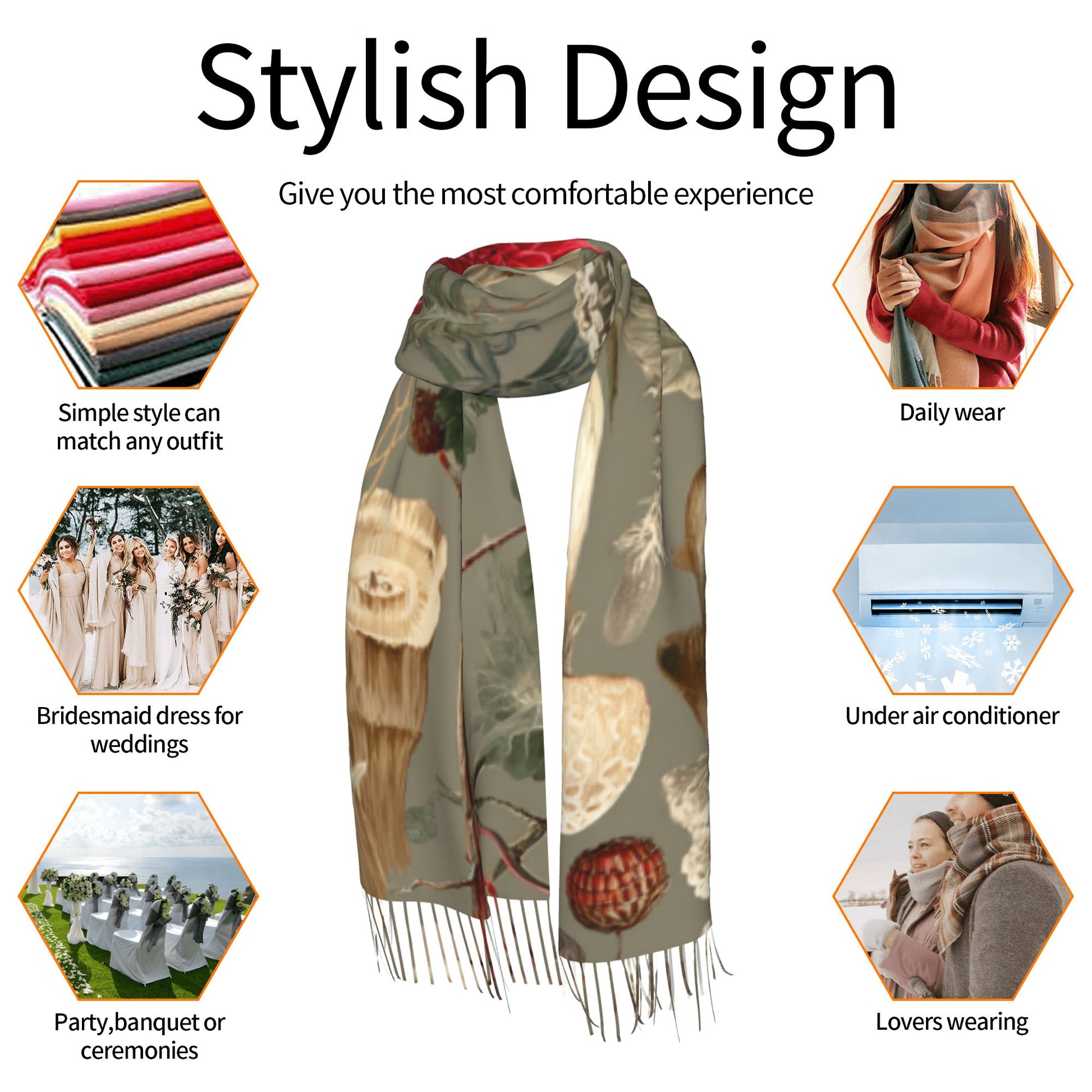 Vintage Botanical Faux Cashmere Tassel Scarf – Oversized Soft Winter Wrap with Mushroom Illustration (77" x 27")